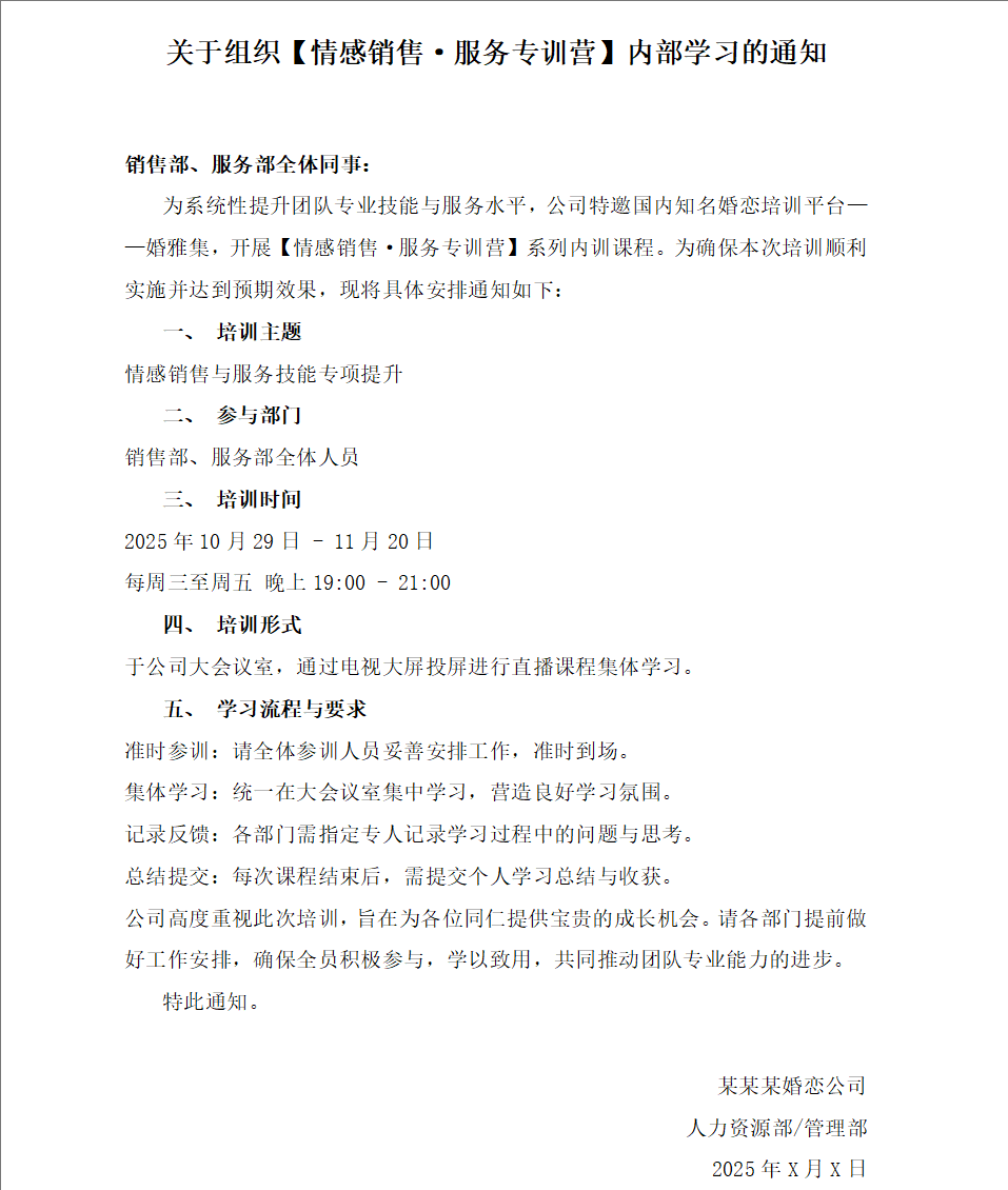 每次内训课程,我们都提供《婚恋公司内部学习通知范本》,方便您安排各个部门学习。